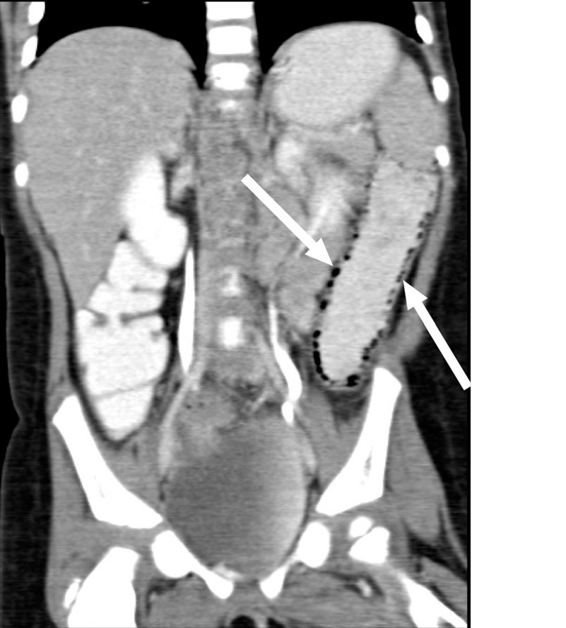 ■ Henoch-Schonlein紫斑病(IgA紫斑病)と診断され、入院のうえプレドニゾロン(1mg/kg)が投与されたが、腹痛が悪化したため腹部CTが施行され、遠位小腸壁肥厚と、下行結腸の腸壁気腫が認められた。