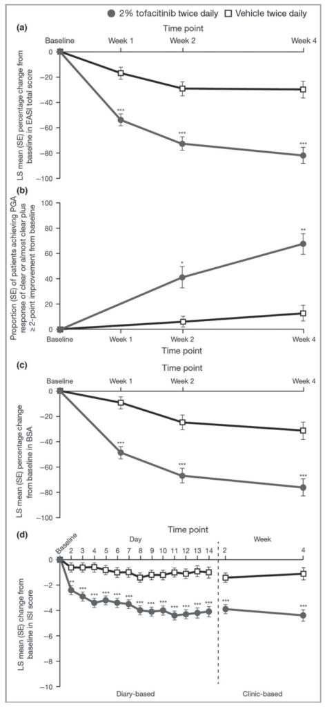 ■ トファシチニブ群は、すべての予定された有効性エンドポイント全体にわたって有意な改善を示し(P < 0.001)、さらに第4週においてそう痒を改善した。