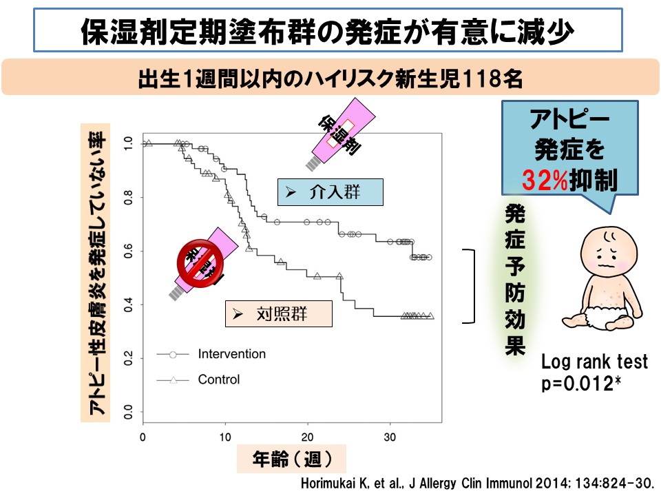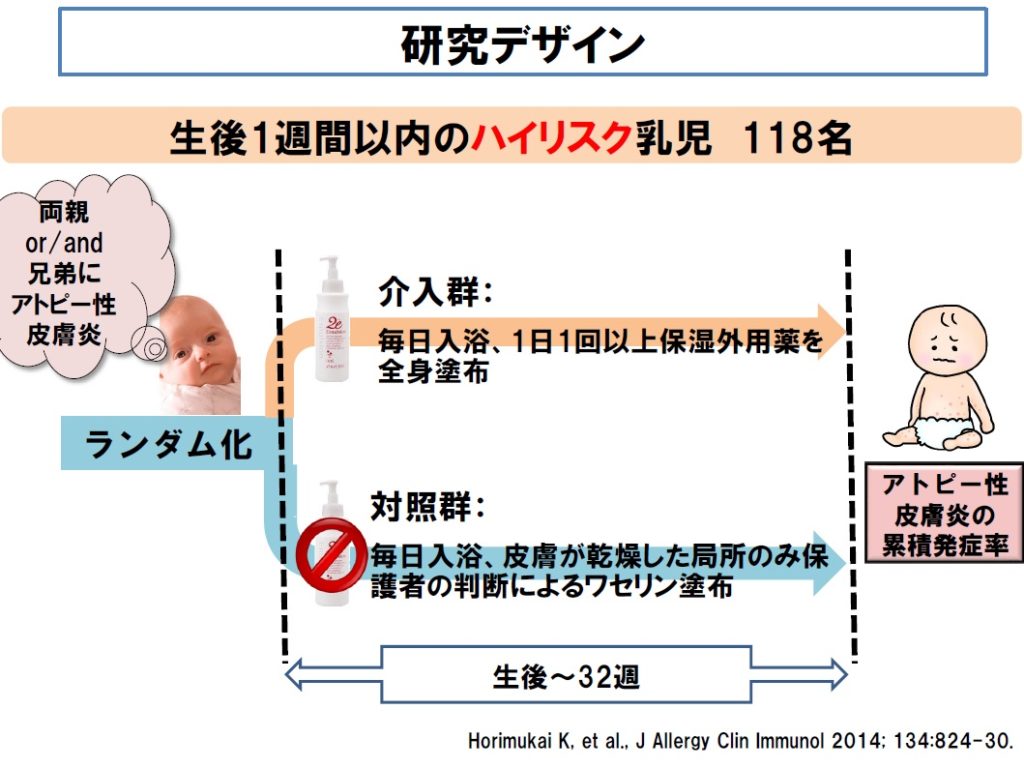 ■ では、「湿疹を発症していない新生児に、最初から保湿剤を定期的に塗る」と、アトピー性皮膚炎の発症は減るでしょうか?出生後1週間以内に保湿剤を塗布する群とそうでない群で生後32週(=約8ヶ月)までの発症を確認した研究があります。
