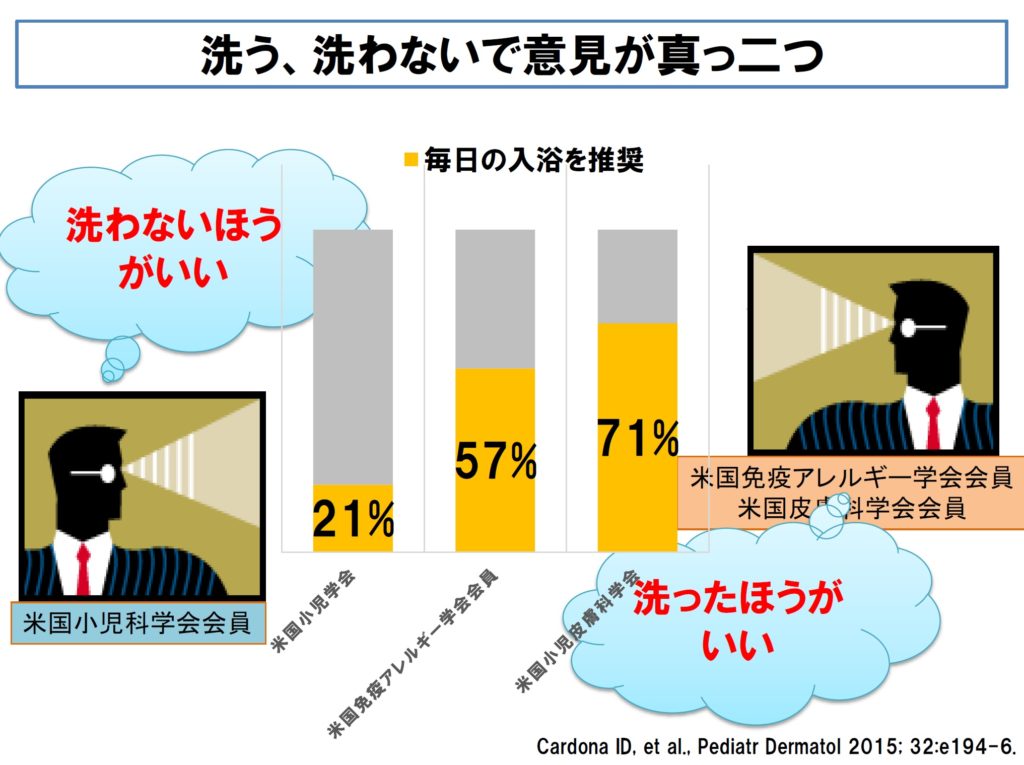 ■ 医療者のなかでも、洗う、洗わないに関し、全く逆のことを指導している場合があります。実際、米国の検討でも、米国免疫アレルギー学会の所属医、米国小児科学会の所属医、小児皮膚科学会の所属医で全く意見が違うという結果になっています。