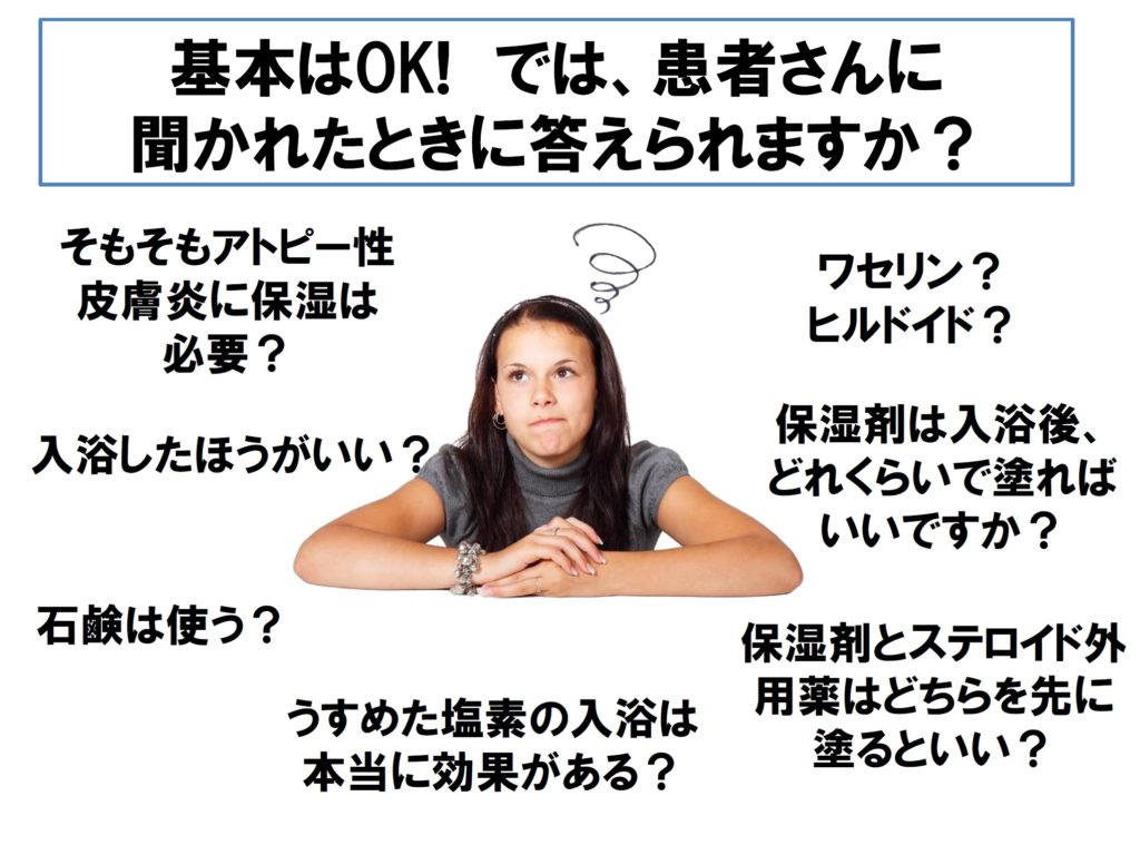 ■ さて、前回お話ししたようなスキンケアの基本に関しては、多くの医療者も理解されています。しかし、現実には様々な質問を受けるのではないでしょうか?