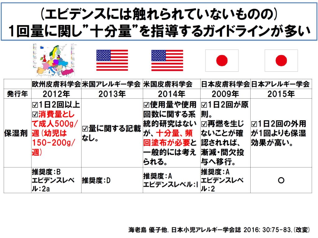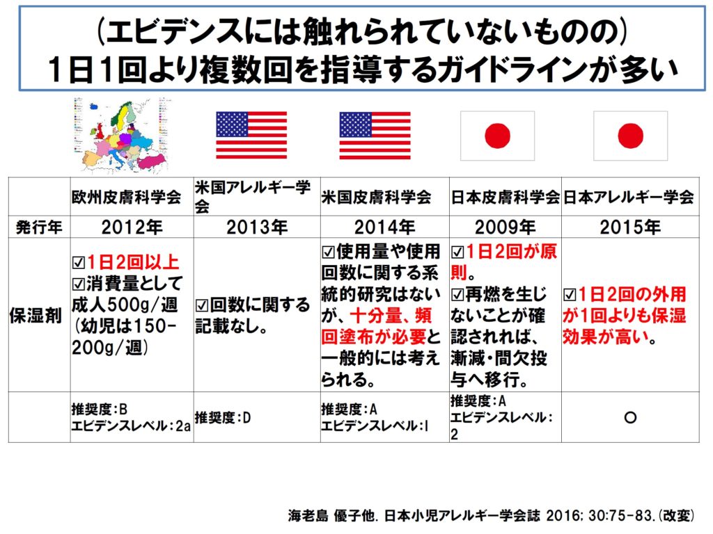 ■ ただ、欧州も米国も日本も、1日複数回の塗布が勧められています。「ガイドラインに書いてあるからエビデンス」とは言えませんが、ここは「地域が違っても意見は一致」で良いかと思います。