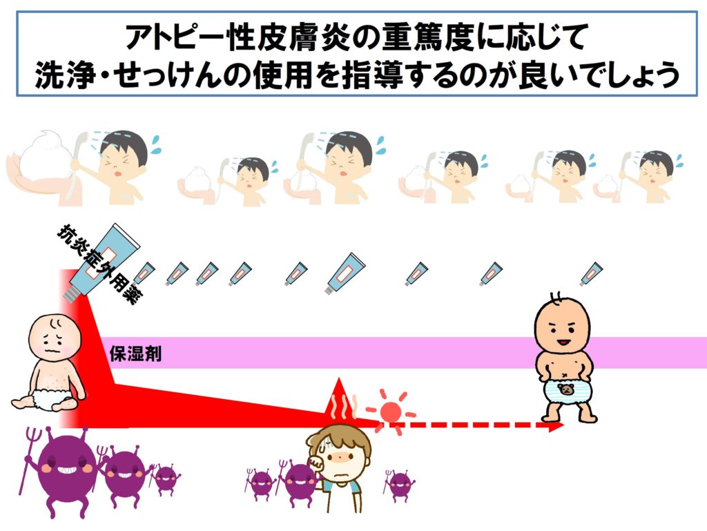 ■ 石けんを使用した場合は、十分なすすぎは必要でしょうし、皮膚が改善してくれば石けんの使用回数を減らしてすすぎのみにするなども方法と考えられます。すなわち、アトピー性皮膚炎の重症度に応じ、洗浄・せっけんの使用を指導するのが良いでしょう。