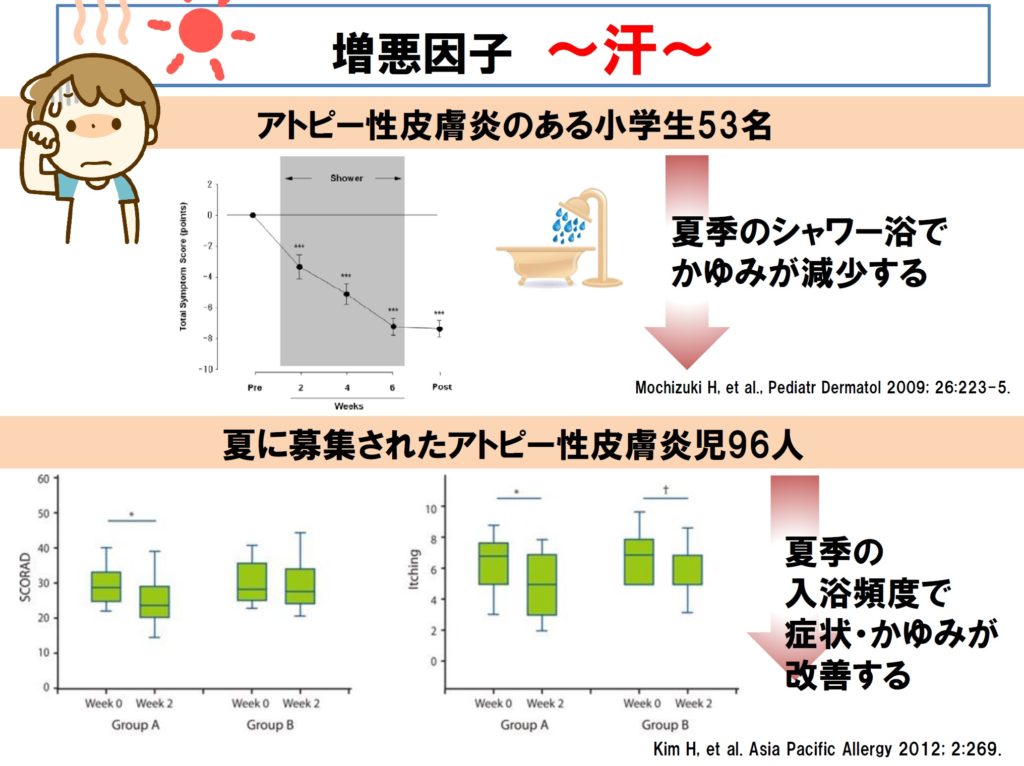 ■ また、特に夏場の汗は悪化要因になります。実際に、夏にシャワー浴や入浴頻度を増やすことでアトピー性皮膚炎のかゆみが減少したという報告が、本邦にも海外にもあります。