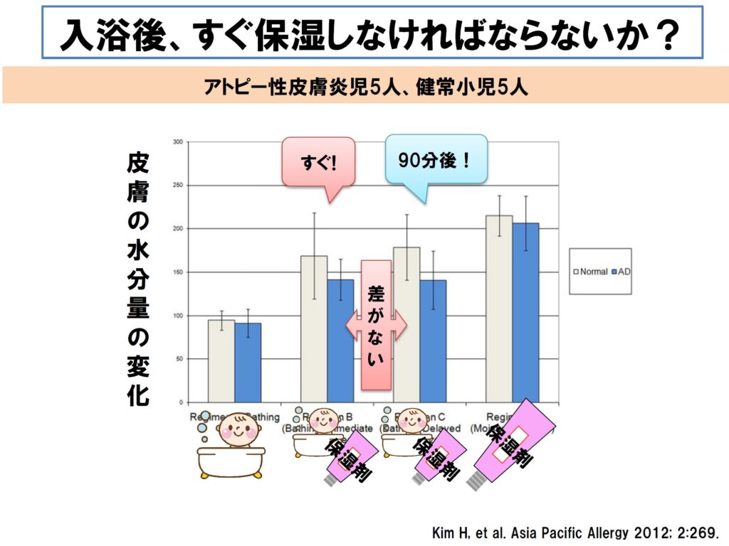 ■ 「入浴後、すぐ塗るように」という指導が多いと思いますが、最近、入浴後すぐと、入浴90分後での皮膚水分量に差がないという研究結果もあります。私は、あまり焦らずに丁寧にケアしてよいとお話ししています。