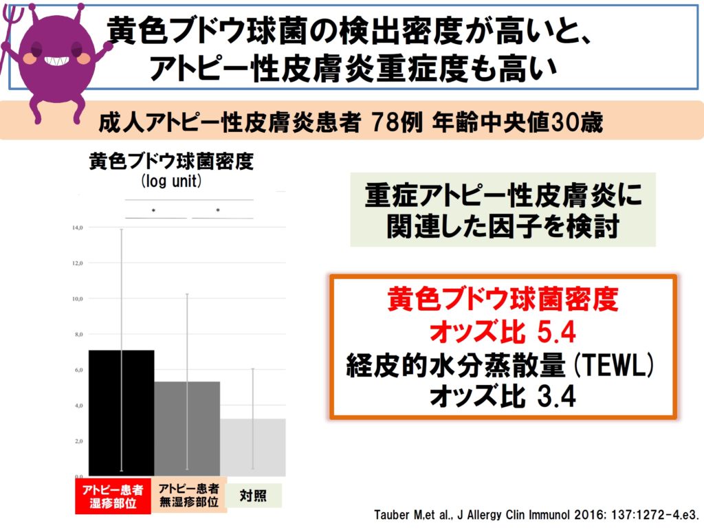 ■ アトピー性皮膚炎が重症化すると、皮膚には黄色ブドウ球菌が高率に検出されるようになり、皮膚における黄色ブドウ球菌の密度が高いと、アトピー性皮膚炎の重症度も高いことが示されています。また、皮膚の黄色ブドウ球菌濃度は、食物アレルギーの発症リスクにもなるという研究結果もあります。