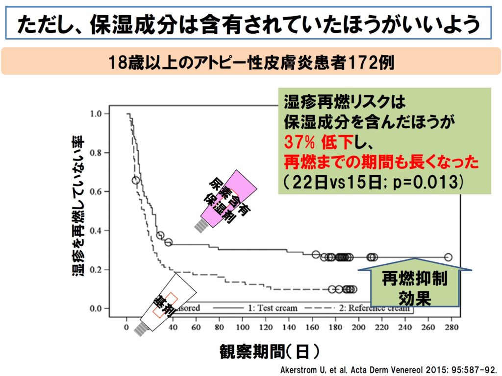 ■ ただし、保湿成分が含有されていたほうが再燃が少ないという成人の研究結果があります。そこで、ワセリンよりは保湿成分が含有されているほうが良いと考えます。