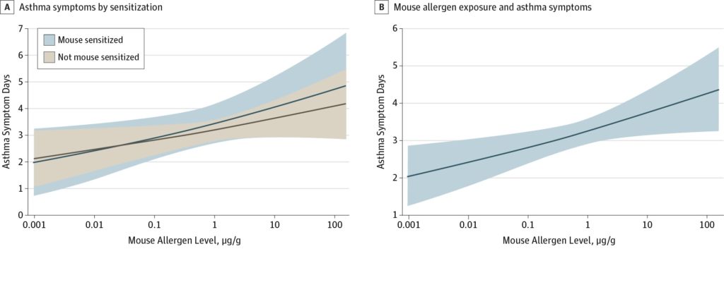 ■ 喘息を持つ都心の学生に対する今回の研究で、学校におけるマウスアレルゲンへの曝露は、喘息の症状の増加と肺機能の低下と関連していた。