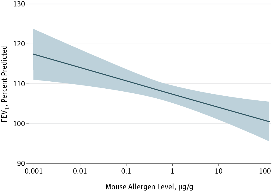 ■ 学校におけるマウスアレルゲンのより高いレベルへの曝露(75パーセンタイルと25パーセンタイルの比較)は、喘息症状の日数(オッズ比1.27; 95%CI、1.05-1.54; P = .02)および予測1秒量が4.0%低下した(95%CI、-6.6〜-1.5; P = .002)。
