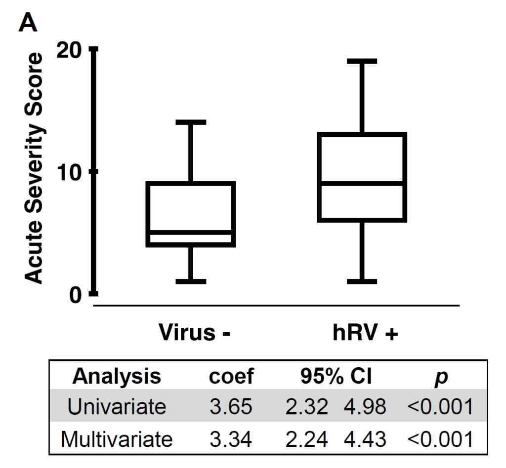 ■ ライノウイルス感染(N = 95)被験者は、ウイルス陰性(N = 60)の被験者よりはるかに高い急性重症度スコアであったことが示唆され(図1)、一般的な危険因子のために調整された後でも、喘息重症度と関連していた。