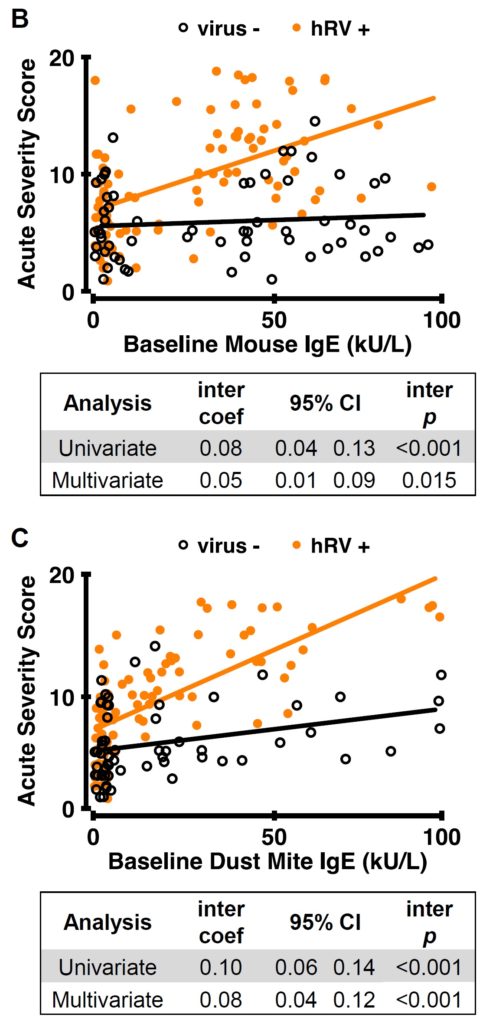 ■ 試験開始時のマウス特異的IgE抗体価とダニ類特異的IgE抗体価がともに、重症度に影響する際にライノウイルス感染症と相互に作用することを示す。アレルゲン感作の程度が増すほど、ライノウイルスをトリガーとした喘息増悪はより厳しくなった。