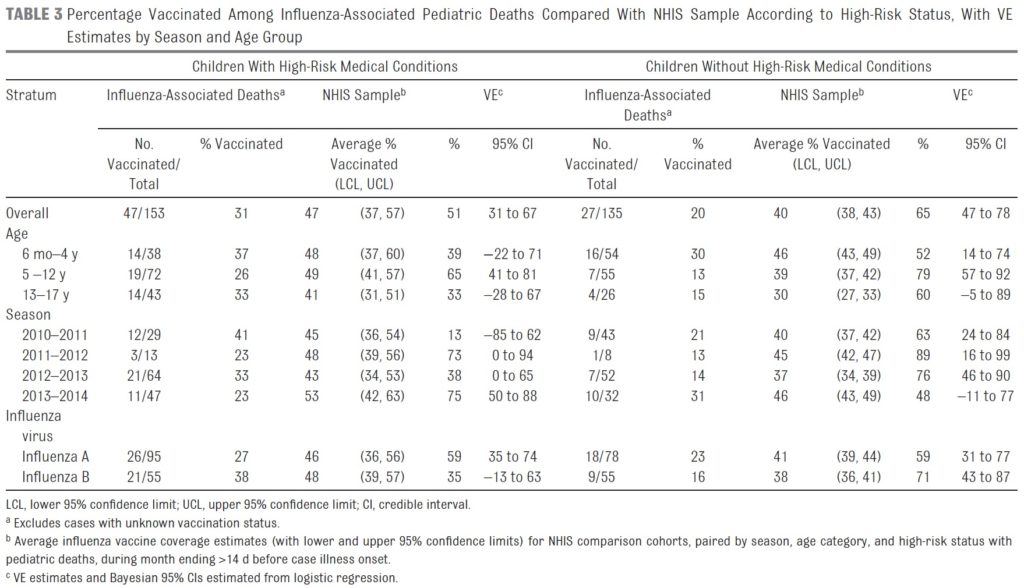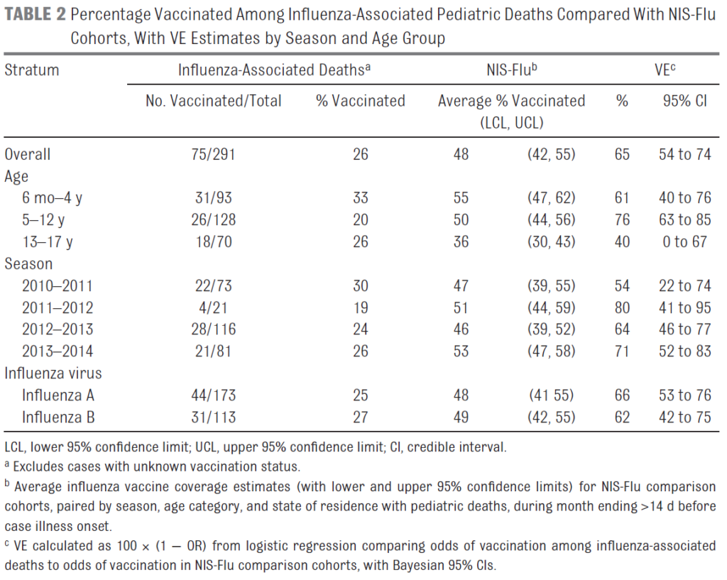 Flannery B, et al. Influenza Vaccine Effectiveness Against Pediatric Deaths: 2010-2014. Pediatrics 2017; 139.