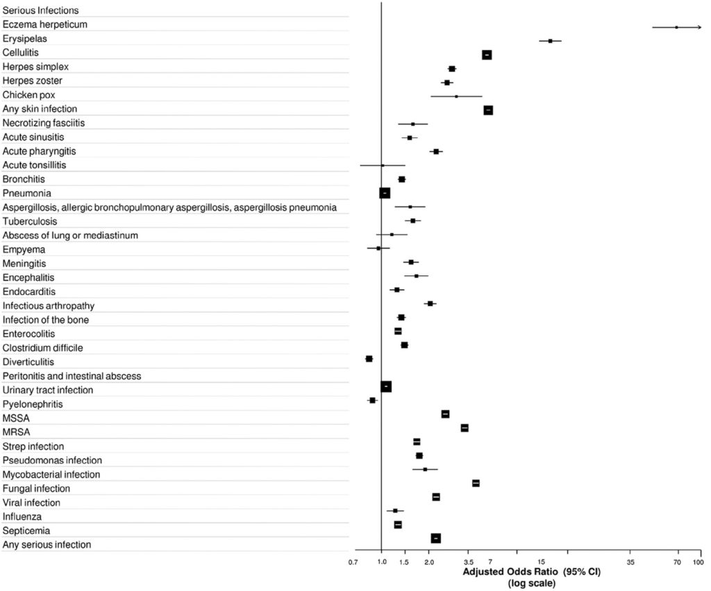 Narla S, Silverberg JI. Association between atopic dermatitis and serious cutaneous, multiorgan and systemic infections in US adults. Annals of Allergy, Asthma & Immunology 2018; 120:66-72. e11.