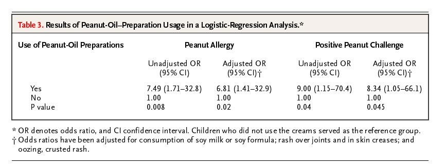 ■ 面接データの解析は、ピーナッツオイルを含有するスキンケア用品の使用(オッズ比、6.8; 95%信頼区間、1.4〜32.9)とピーナッツアレルギーに独立した有意な関連を示した。