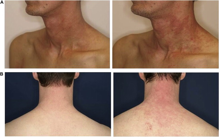 ■ 衣服に覆われた皮膚領域よりもむしろ曝露された部位の顕著な湿疹の再燃が生じた。