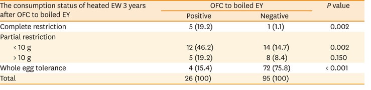 固茹でゆで卵黄で食物経口負荷試験を受けた121人が、3年後に加熱全卵が摂取できるようになっているかを比較した。