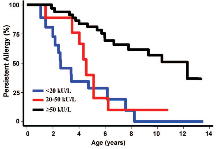 ■ 記録された小麦特異的IgE抗体価のピーク値は、小麦アレルギーが持続する有用な予測因子だった(P<.001年)が、小児の大部分は小麦特異的IgE抗体価が高値でも小麦アレルギーを克服した。