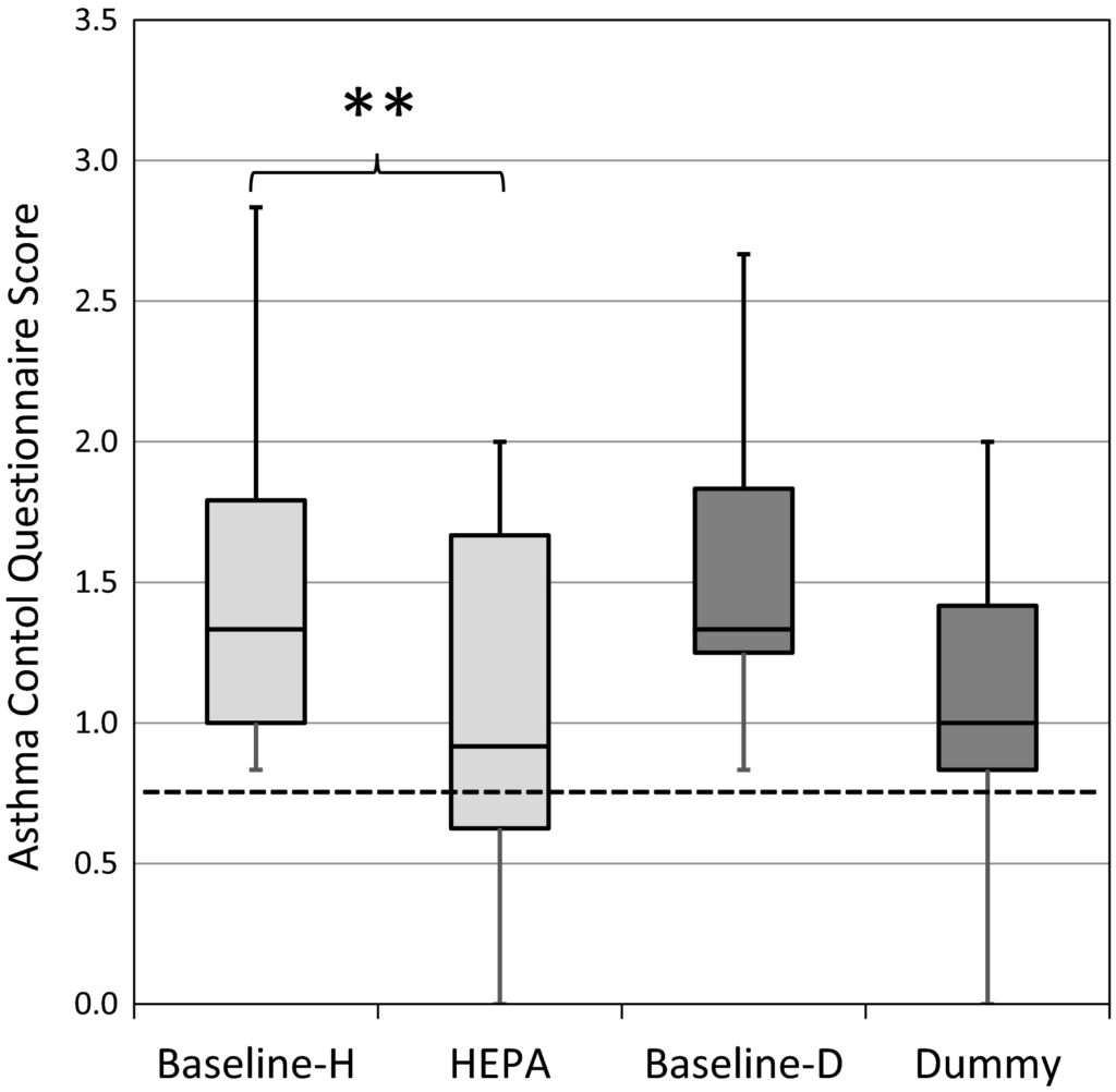 ■ 試験開始時において喘息のコントロールが不良で生活の質が低い参加者では、ACQとAQLQスコアはHEPA治療後に有意に改善した( それぞれ、1.3 → 0.9; P = .003 / 4.9 → 5.5; P = .02 )。