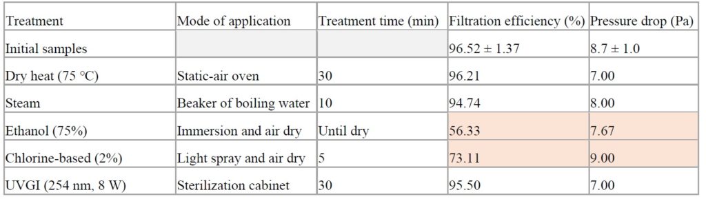 ■ 最後に、スチーム、アルコール、家庭用漂白剤は全て濾過効率を低下させ、使用者をウイルスを含むエアロゾルの影響を受けやすくする可能性があり、液体や蒸気を含む処理には注意が必要である。