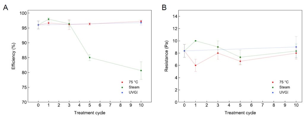 ■ これらの中で、さまざまな湿度(相対湿度100%以下)の加熱(85℃以下)は、N95グレードの保護具と同様にメルトブローン製保護具のろ過特性の保護のために最も有望な非破壊的な方法だった。