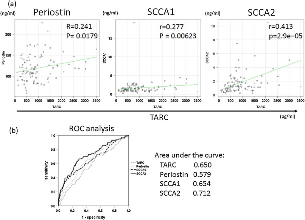 ■ 検討されたバイオマーカーの中で、血清SCCA2はまた、臨床的なAD重症度やTARCとの最も良好な相関を示し、ROC分析におけるADの診断性能がもっとも良かった。