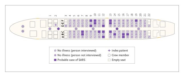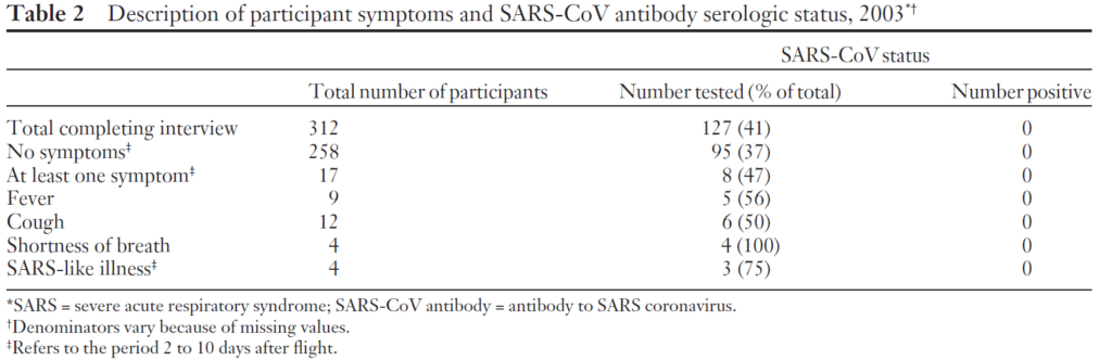 SARSに感染した患者が搭乗した航空機にいあわせた1,766人の乗客および乗務員のうち339人(19%)に連絡をとり、症状・抗体を確認した。