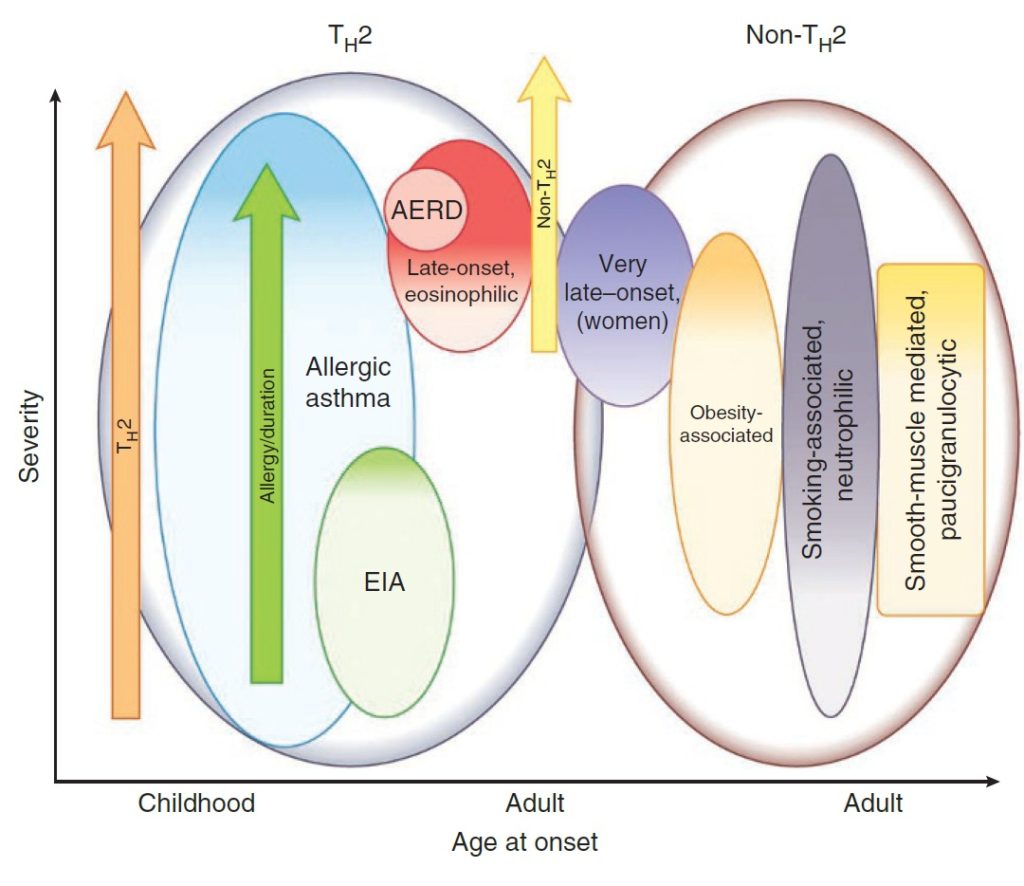 ■ 喘息にはさまざまなフェノタイプがあり、小児では比較的Th2型が多く、成人では非Th2型が多くなります。