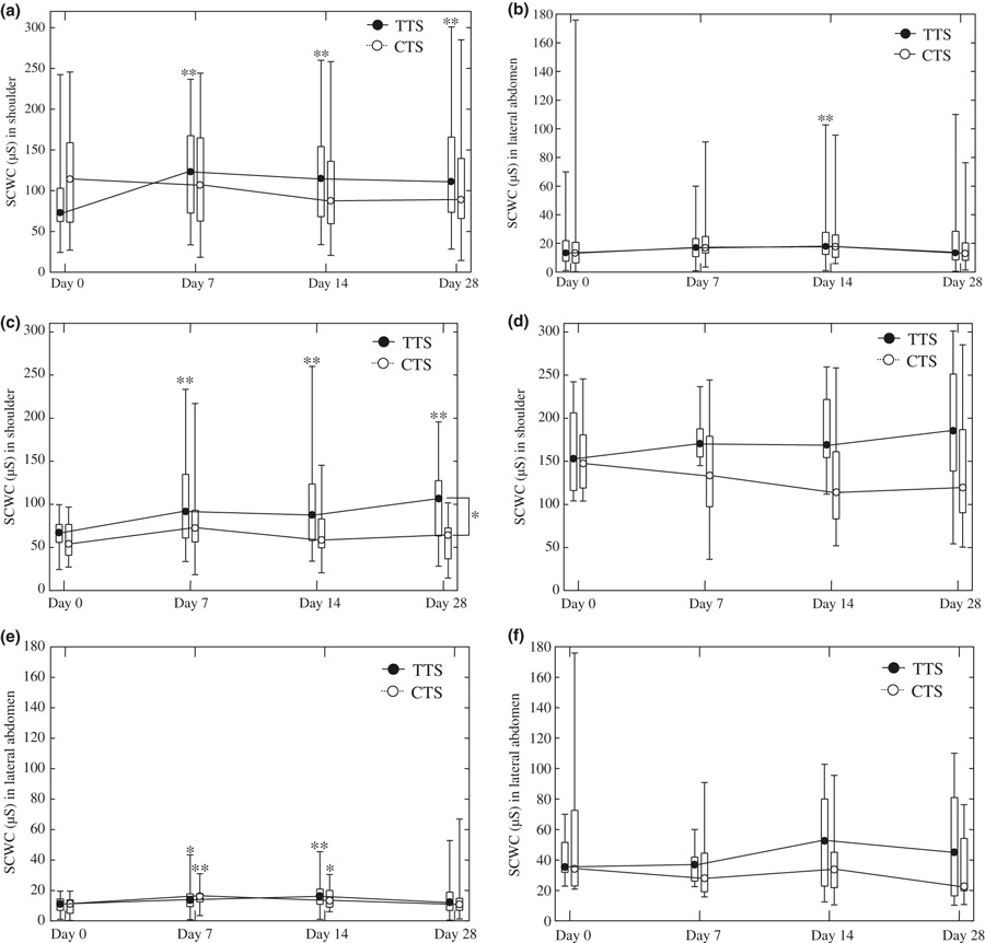 ■ SCWCの有意な改善が、FSCで処理したTシャツを着用した肩(7~28日目)と側腹部(14日目)の皮膚で観察されたが、処理していないTシャツでは観察されなかった。