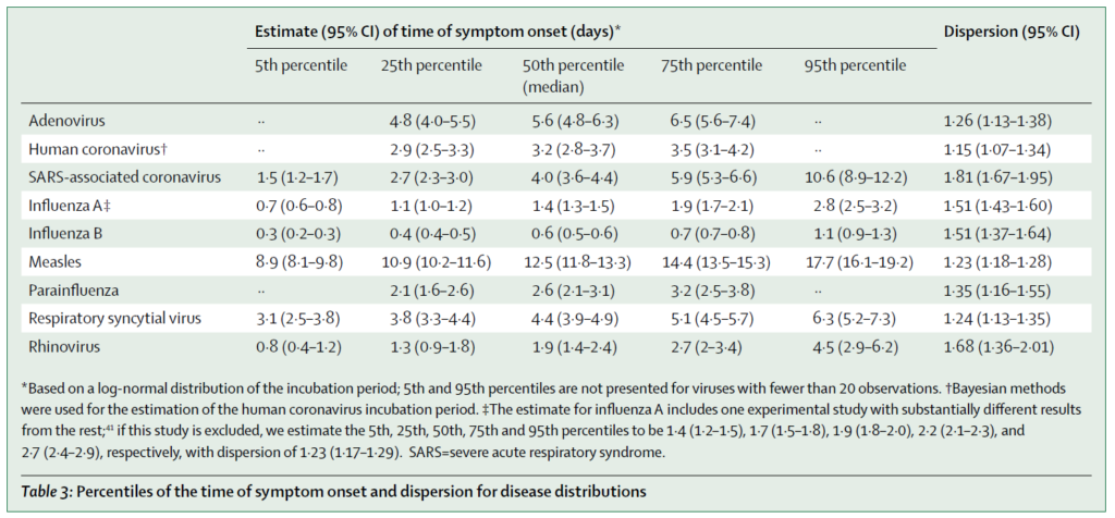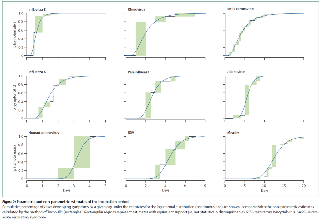 Lessler J, et al. Incubation periods of acute respiratory viral infections: a systematic review. Lancet Infect Dis 2009; 9:291-300.