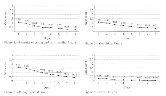 ■ 各項目(医師の観察と保護者の観察)のp値は、1日目から8日目までに統計的に有意なP<0.001の改善だった。