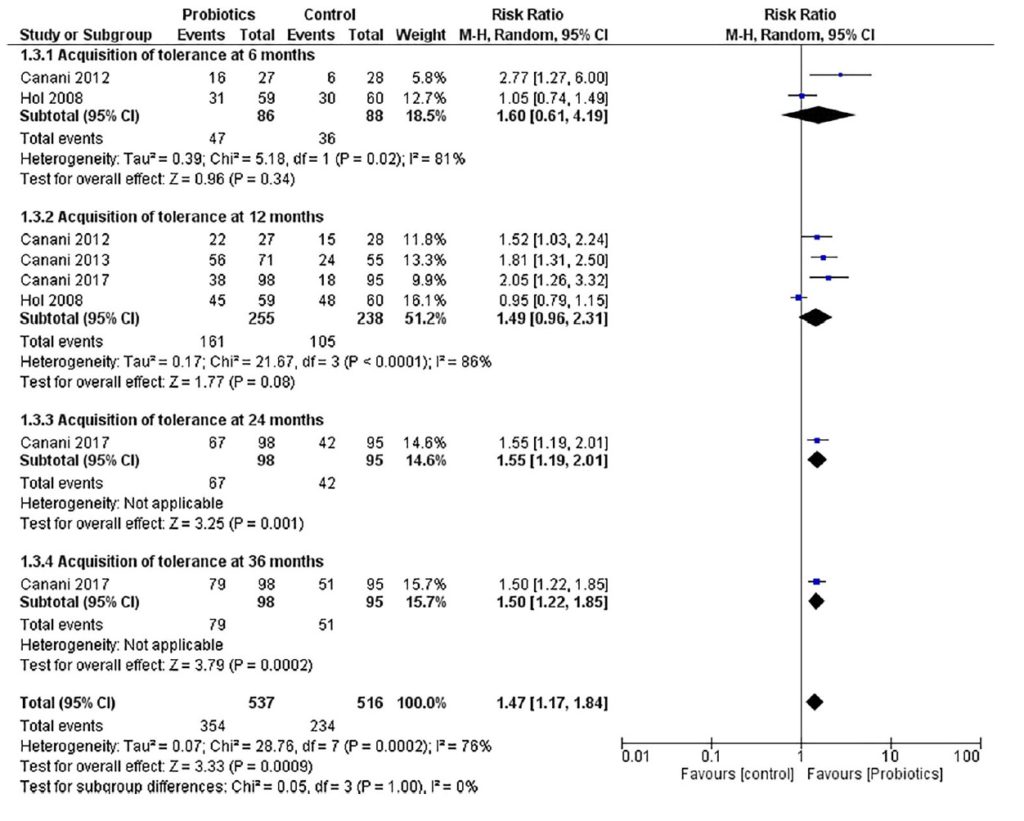 ■ 確認されたCMPAでは、プロバイオティクスはプラセボと比較して3年後のCMP耐性率が高いことと関連した(493人;RR 1.47; 95%CI 1.17~1.84; p = 0.0009;LOE; 低)。
