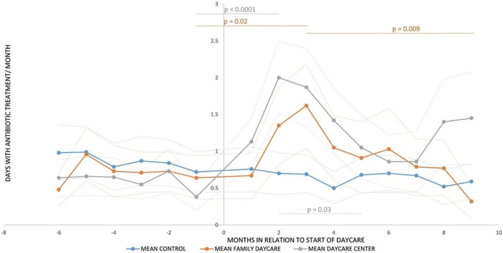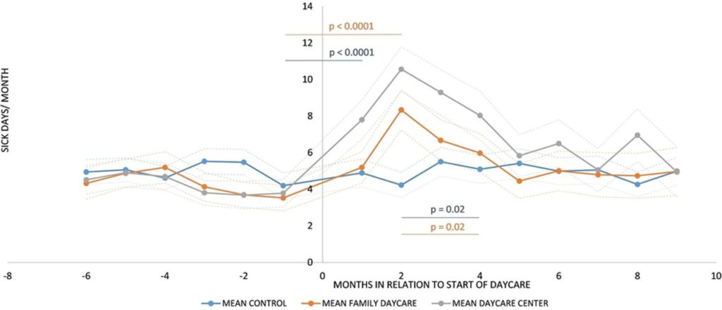 ✅ 集団保育に行きはじめの数ヶ月は大幅に子どもの呼吸器感染症は増加するが、9ヶ月程度で徐々に落ち着いてくるといえそうだ。