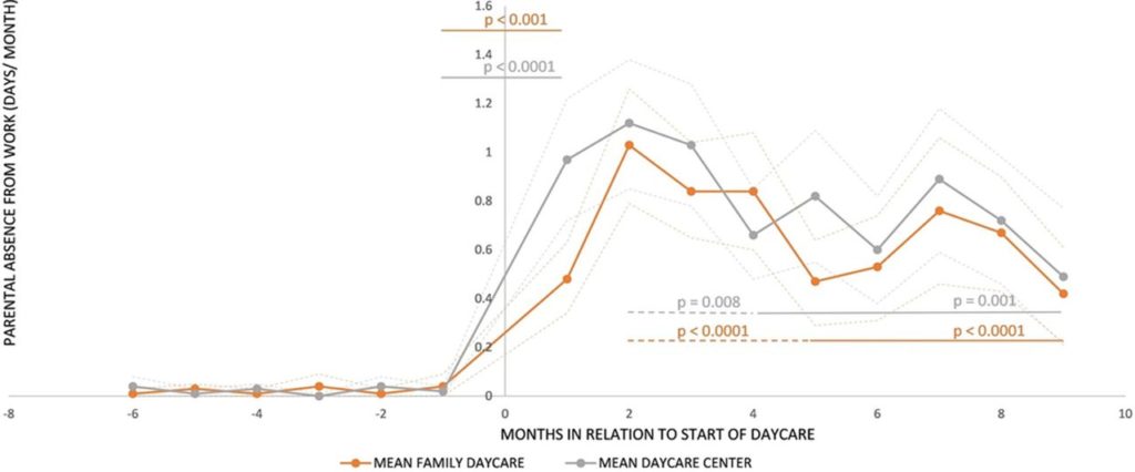 論文より引用。保護者の欠勤回数も数ヶ月間は多くなり、徐々に落ち着く。しかし、ベースラインまでは戻らない。