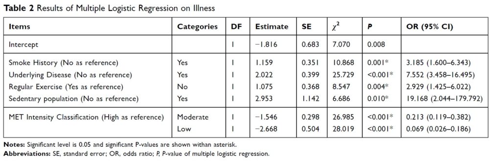 ■ COVID-19感染者と未感染者を比較したところ、不規則な運動(P=0.004)や、座りきりの生活習慣(P=0.010)、過労(P<0.001)がCOVID-19への感染性と関連している可能性があることが示された。