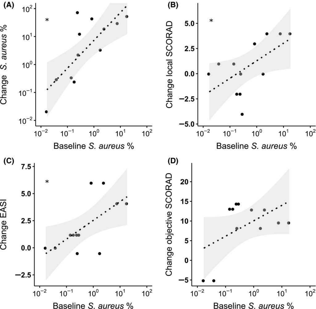 論文より引用。試験開始時の皮膚黄色ブドウ球菌量は、8週間後の重症度に関連した。