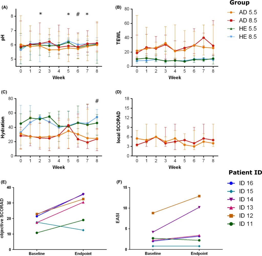 ■ 黄色ブドウ球菌は中性pHで最も増殖するため、パイロット研究でこれらの因子とADの重症度の縦断的な相互作用を調査した。