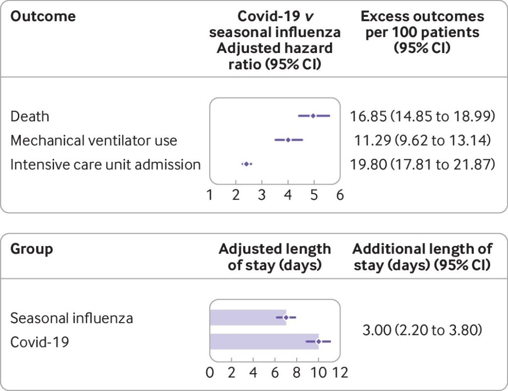 ■ またCOVID-19は、季節性インフルエンザと比較して、死亡(ハザード比 4.97; 95%信頼区間 4.42 ~5.58)、人工呼吸器使用(ハザード比4.01; 95%信頼区間 3.53 ~4.54)、集中治療室への入院 (ハザード比 2.41; 95%信頼区間 2.25 ~2.59)、付加的な入院日数(ハザード比 3.00; 95%信頼区間 2.20~3.80)と、リスクが高かった。