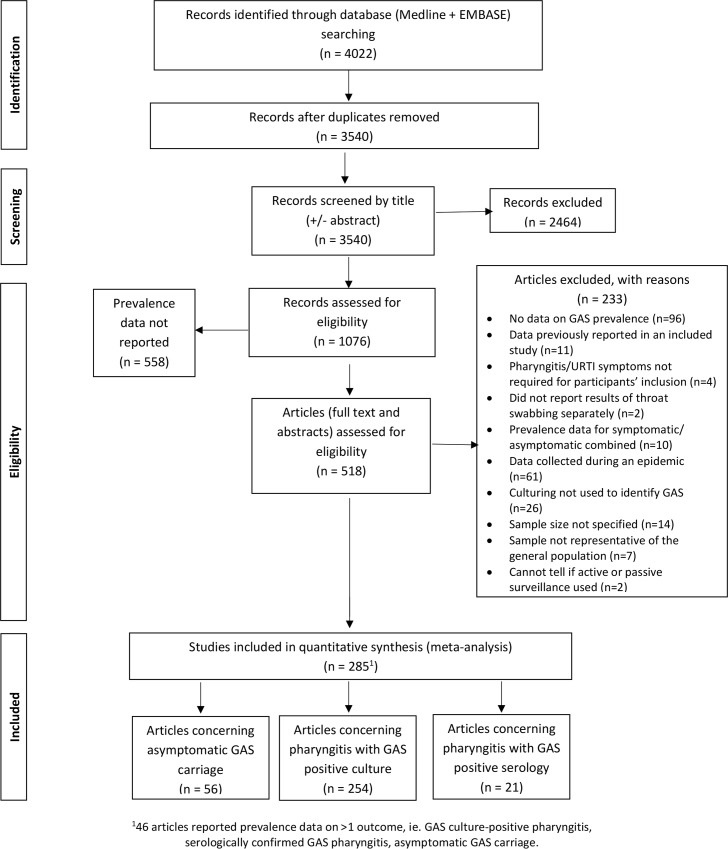 ■ GAS+veもしくは血清学的に確認されたGAS咽頭炎に関する有病率データを報告している研究において、参加者が咽頭炎もしくは上気道感染症(upper respiratory tract infection; URTI)の症状を示したと述べられいているものを含めた。
