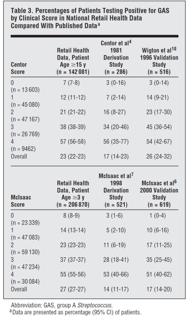 ■ 我々の研究では、CentorとMcIsaacのスコアを検証し、リテールヘルスチェーンに咽頭痛のある患者のGAS感染のリスクをより正確に分類した。