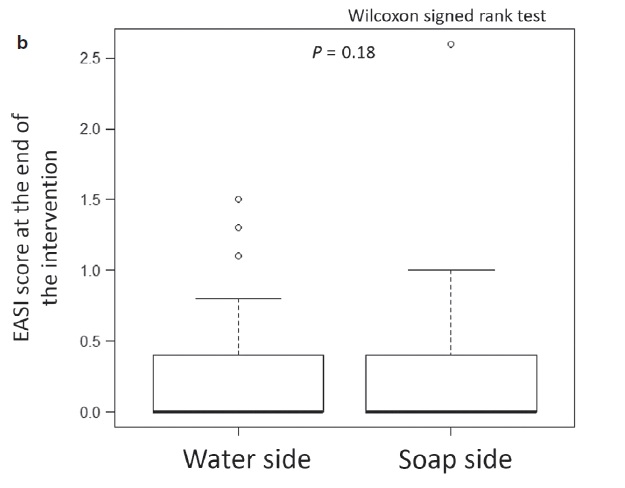 ■ water sideとsoap sideの8週目±3週目におけるEASIスコアは、それぞれ0.0(0.0-0.4)および0.0(0.0-0.4)だった(P = 0.18)。
