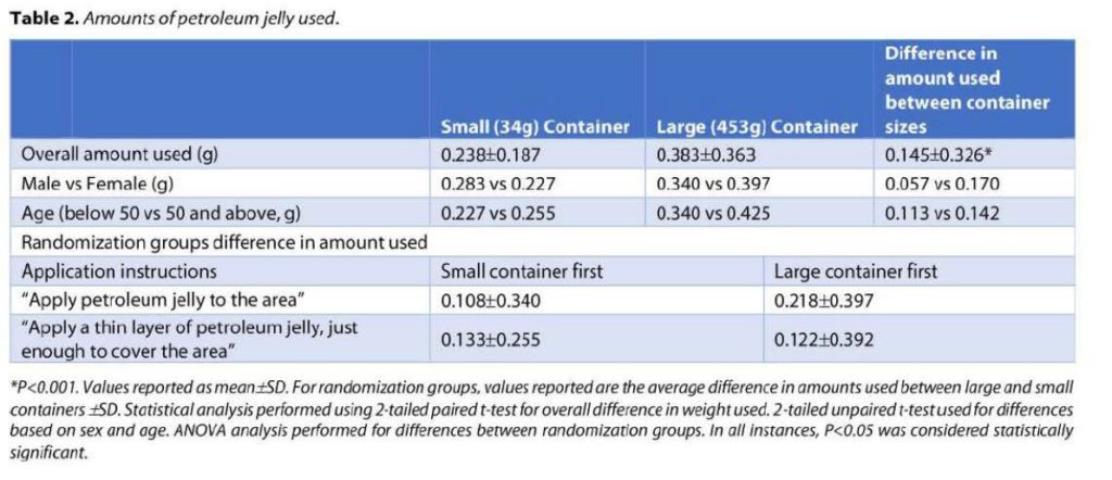 128人の参加者に対し、大きな容器(453g)のワセリンと小さなチューブ(34g)のワセリンを塗布してもらい、その塗布量を比較した。