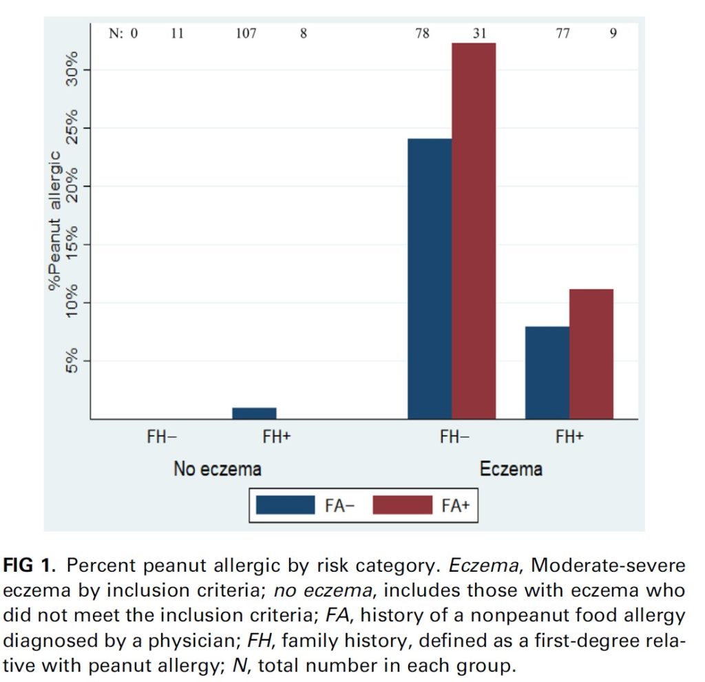■ (1)中等症・重症のアトピー性皮膚炎、(2)ピーナッツ以外の食物アレルギー(food allergy; FA)、および/または(3)ピーナッツアレルギーのある一親等親族の乳児(first-degree relative with peanut allergy; FH)を対象に、ピーナッツ開始前にピーナッツアレルギー(peanut allergy; PA)のリスクを明らかにしようとした。
