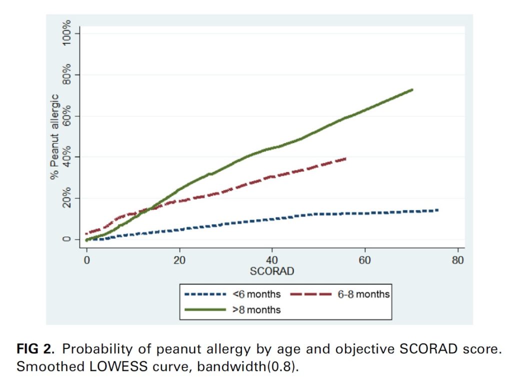 論文より引用。SCORAD(アトピー性皮膚炎の重症度)が高くなるほど、月齢が高くなるほど、ピーナッツアレルギーの発症リスクは高くなる。