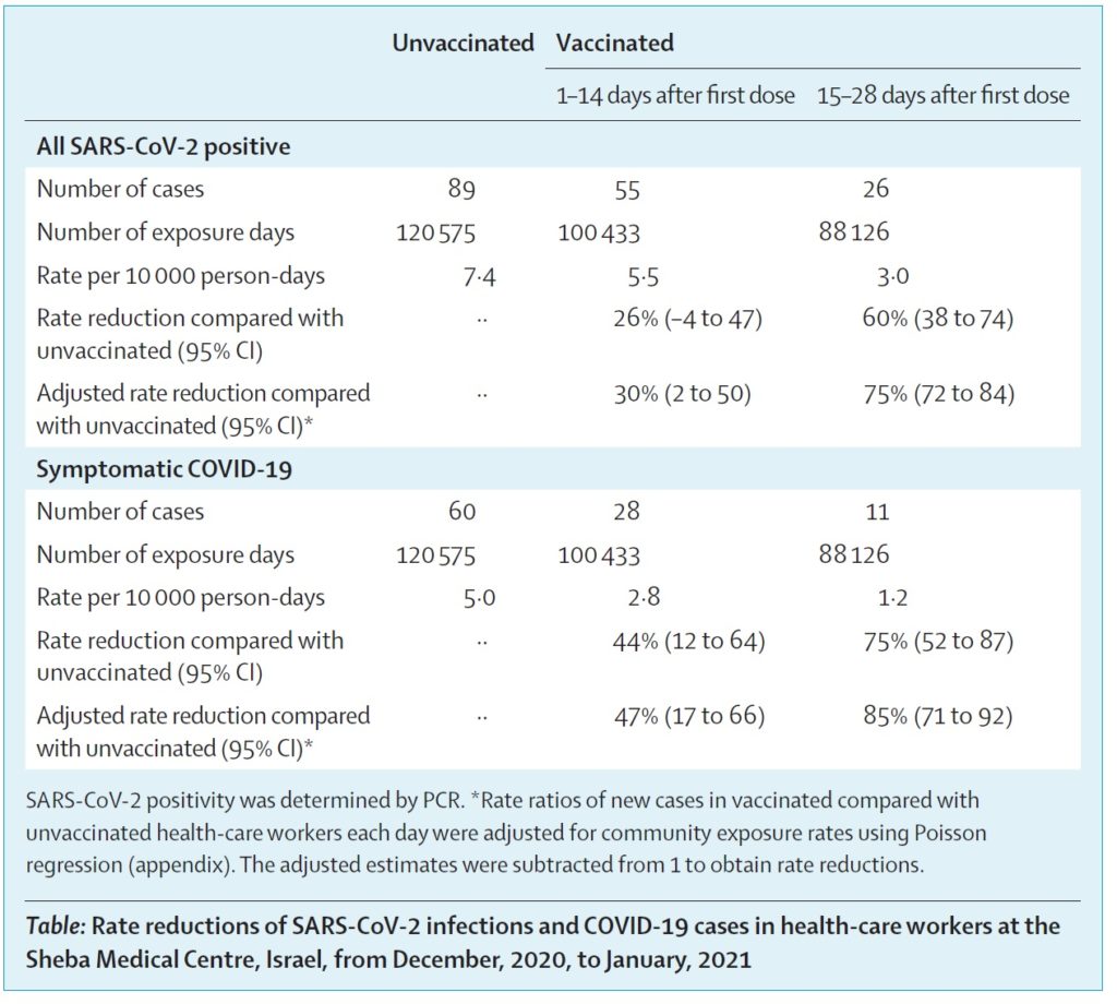 Amit S, et al. Early rate reductions of SARS-CoV-2 infection and COVID-19 in BNT162b2 vaccine recipients. Lancet.