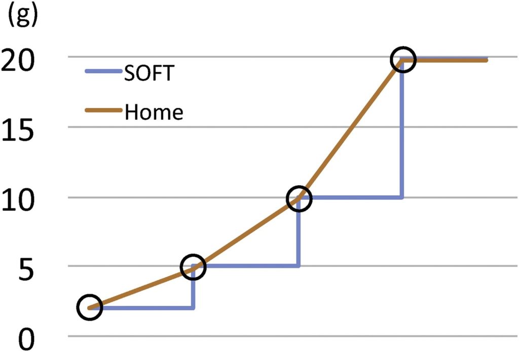 すなわち、週4回未満は許可されていません(食べていない場合は増量不可)。SOFT群は、ゆで卵白5、10、20gの単回投与の食物負荷試験を実施されました(それぞれ受診2回目、3回目、4回目)、無症状または軽微な症状でOFCにパスすると、負荷量を継続して摂取しました。在宅増量群は、指示された量の摂取できた場合は、1週間ごとに自宅で約20%増量しました。