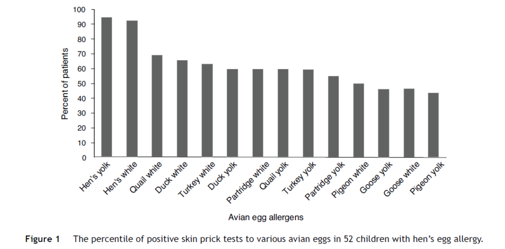 Moghtaderi M, et al. The frequency of cross-reactivity with various avian eggs among children with hen’s egg allergy using skin prick test results: fewer sensitizations with pigeon and goose egg. Allergologia et immunopathologia 2020; 48:265-9.