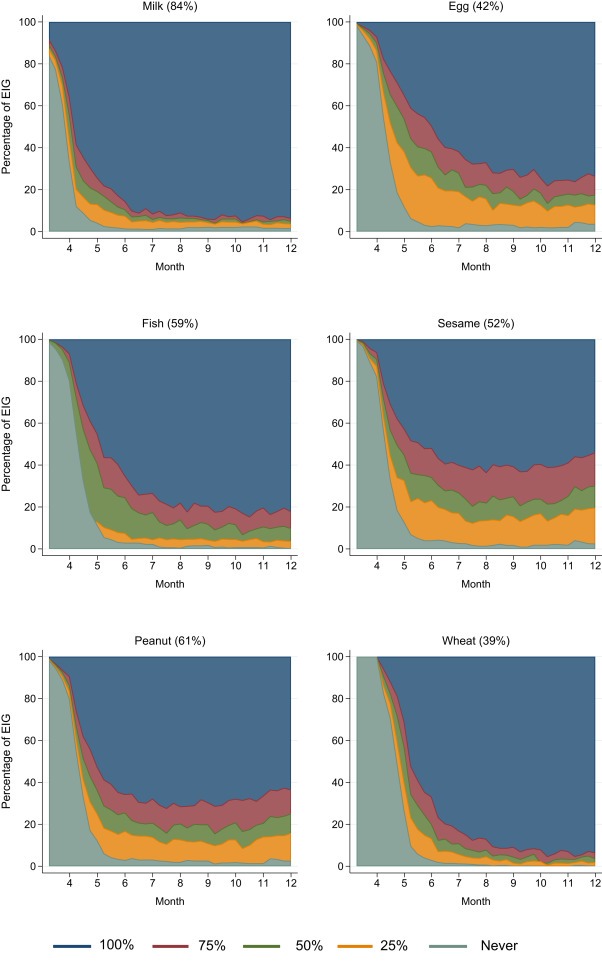 論文から引用。乳、卵、魚、ごま、ピーナッツ、小麦の導入時期。