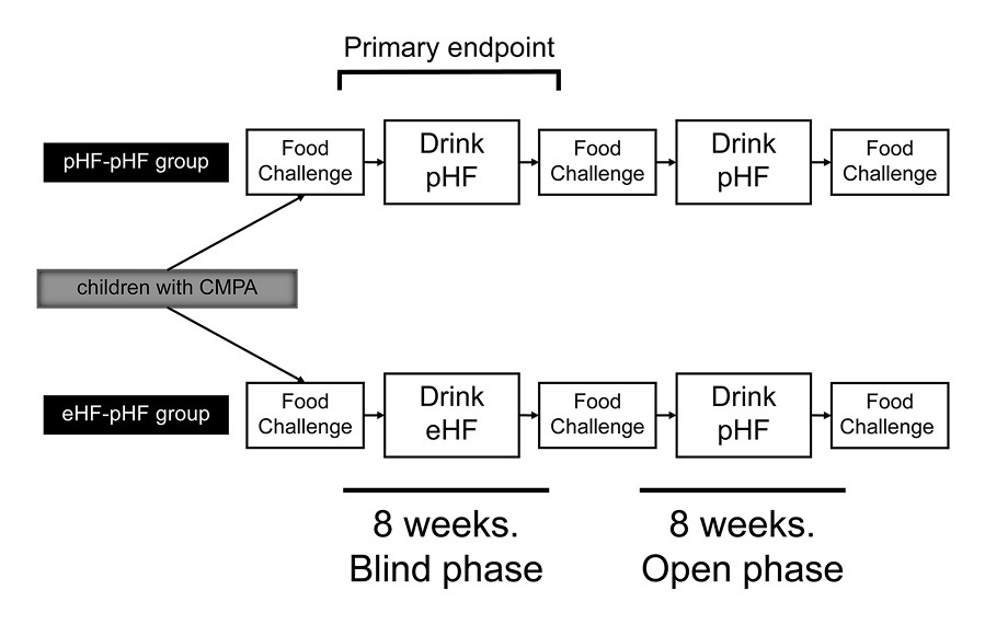 ■ 参加者は、二重盲検法によるpHF-pHF群と、広範囲に加水分解された乳粉ミルク(extensively hydrolyzed cow’s milk protein-based formula; eHF)とpHF群にランダム化した。