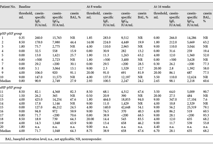 ■ カゼイン特異的IgE抗体価は、eHF-pHF群において、試験開始から第2フェーズまでに有意な減少が見られた(p = 0.014)。