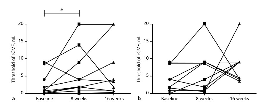 ■ 試験開始時から第1フェーズ終了までの閾値は、pHF-pHF群で有意に上昇した(p = 0.048)が、eHF-pHF群では上昇しなかった。